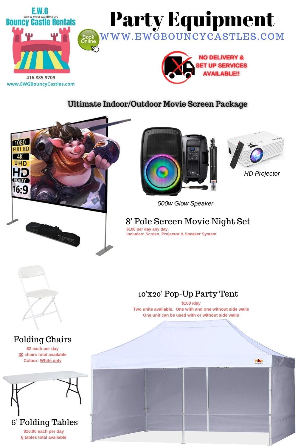 Prices below are based on YOU picking up / setting up yourself (and it's easy to do!). All rentals are subject to a refundable $100 damage / cleaning deposit which is returned by EMT within 48 hours after inspection.