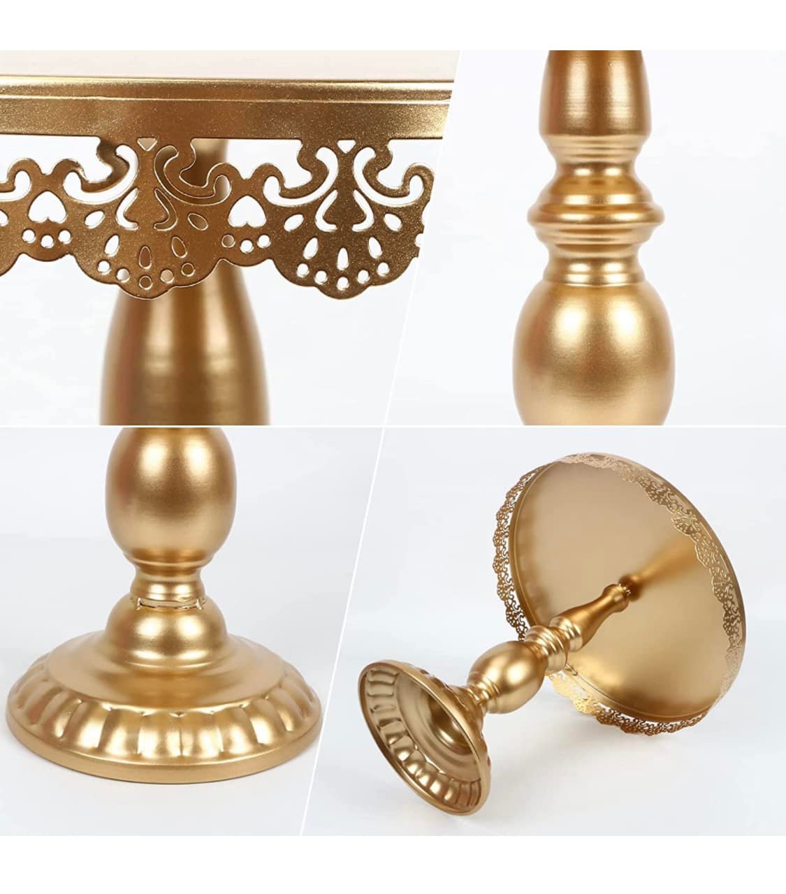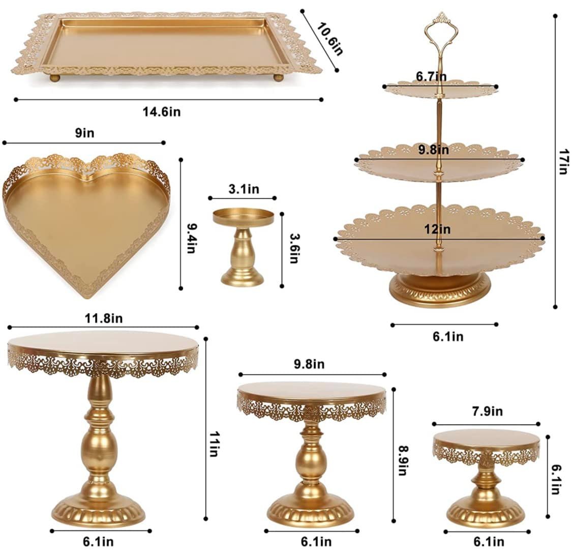 Elevate your DIY dessert table game with this classy and functional 9 piece gold stand set. You get all the pieces as shown.