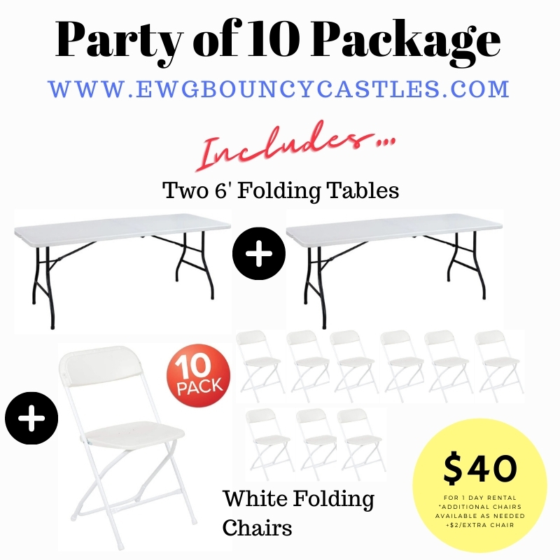 Our folding tables conveniently fold in half for easy transportation. Do you need extra seating space, a gift table, or even just more place to put food ?? - these are a perfect addition to any party.
